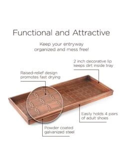 This multi-purpose boot tray is as versatile as it is attractive! Use it for shoes in the entryway or mudroom to keep floors clean; as an attractive home for potted plants; or as a neat, no-mess zone for pet bowls. Raised lip keeps items – or mess – inside tray. Powder-coated galvanized steel constructed with a copper finish.